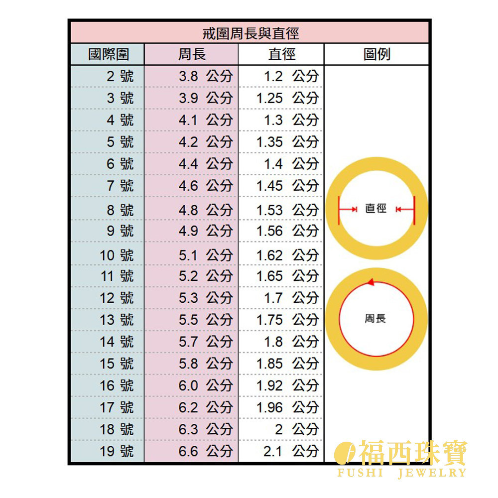 - 戒指:常規尺寸是活動戒圍,可任意調整圈口大小。固定圍依『國際圍』為衡量標準,國際圍標準如下: